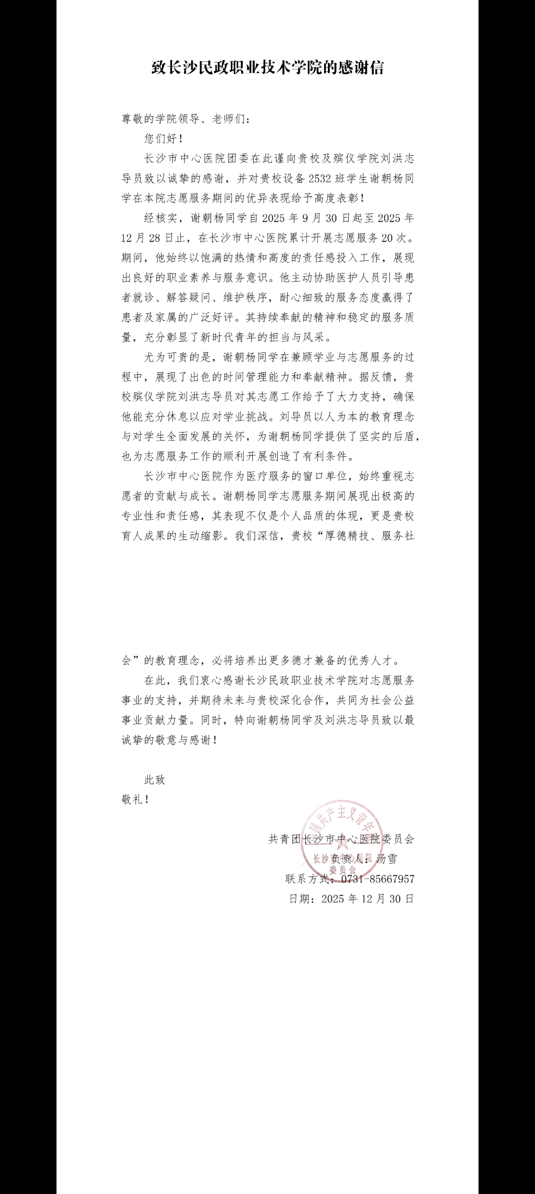 来信内容: 致长沙民政职业技术学院的感谢信 尊敬的学院领导、老师们: 您们好! 长沙市中心医院团委在此谨向贵校及殡仪学院刘洪志 导员致以诚挚的感谢,并对贵校设备 2532 班学生谢朝杨同 学在本院志愿服务期间的优异表现给予高度表彰! 经核实,谢朝杨同学自 2025 年 9 月 30 日起至 2025 年 12 月 28 日止,在长沙市中心医院累计开展志愿服务 20 次。 期间,他始终以饱满的热情和高度的责任感投入工作,展现 出良好的职业素养与服务意识。他主动协助医护人员引导患 者就诊、解答疑问、维护秩序,耐心细致的服务态度赢得了 患者及家属的广泛好评。其持续奉献的精神和稳定的服务质 量,充分彰显了新时代青年的担当与风采。 尤为可贵的是,谢朝杨同学在兼顾学业与志愿服务的过 程中,展现了出色的时间管理能力和奉献精神。据反馈,贵 校殡仪学院刘洪志导员对其志愿工作给予了大力支持,确保 他能充分休息以应对学业挑战。刘导员以人为本的教育理念 与对学生全面发展的关怀,为谢朝杨同学提供了坚实的后盾, 也为志愿服务工作的顺利开展创造了有利条件。 长沙市中心医院作为医疗服务的窗口单位,始终重视志 愿者的贡献与成长。谢朝杨同学志愿服务期间展现出极高的 专业性和责任感,其表现不仅是个人品质的体现,更是贵校 育人成果的生动缩影。我们深信,贵校“厚德精技、服务社会”的教育理念,必将培养出更多德才兼备的优秀人才。 在此,我们衷心感谢长沙民政职业技术学院对志愿服务 事业的支持,并期待未来与贵校深化合作,共同为社会公益 事业贡献力量。同时,特向谢朝杨同学及刘洪志导员致以最 诚挚的敬意与感谢! 此致 敬礼! 共青团长沙市中心医院委员会 负责人:汤雪 联系方式:0731-85667957 日期:2025 年 12 月 30 日